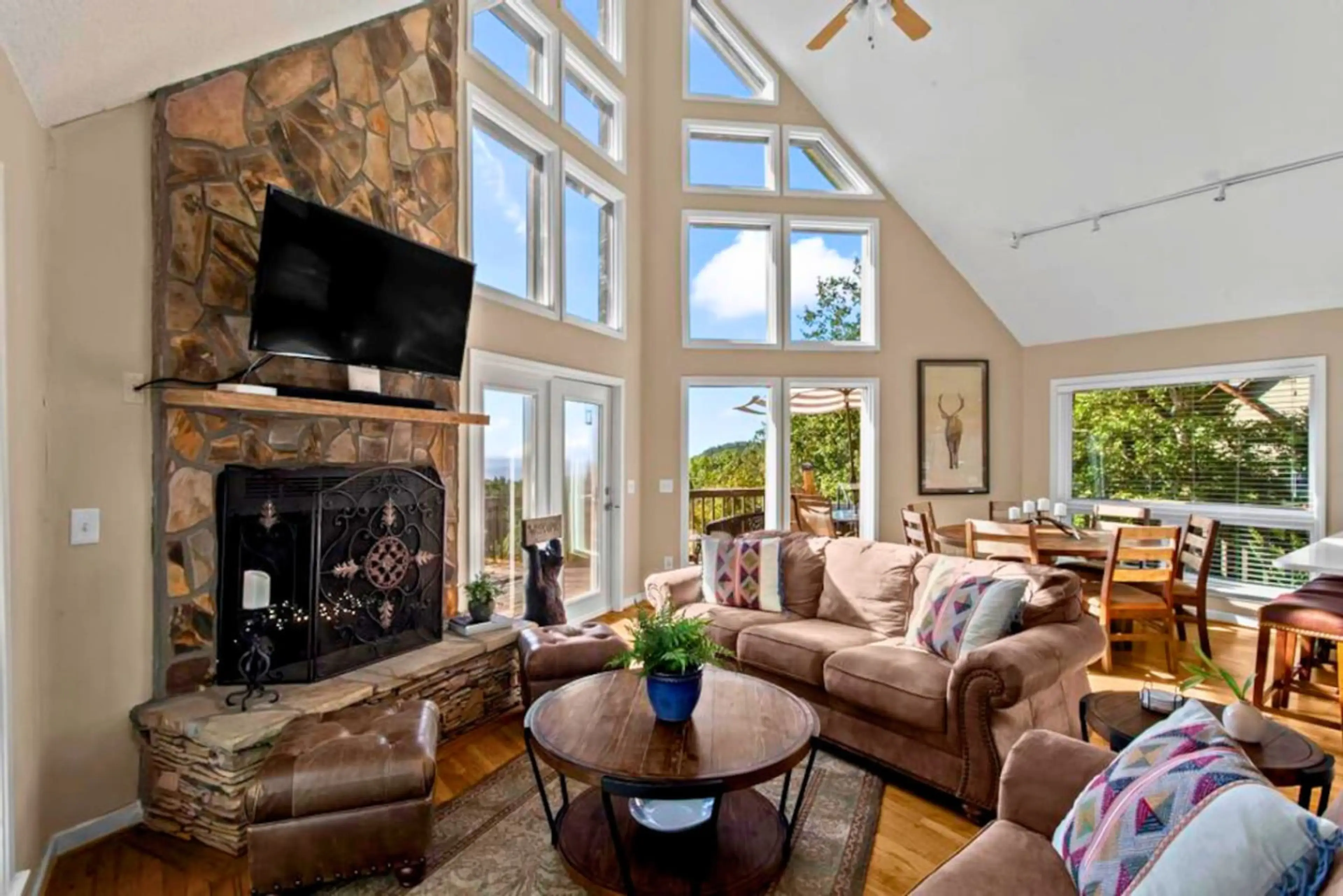 Bella Vista A-Frame offers a peaceful getaway on Lookout Mountain in Menlo, GA. Relax on the spacious deck with mountain and pool views, enjoy the hot tub, or take a dip in the seasonal pool. This cozy A-frame is the perfect blend of comfort and serenity. ➤ Sunset/Sunrise Views ➤ Large Deck w/ Over...